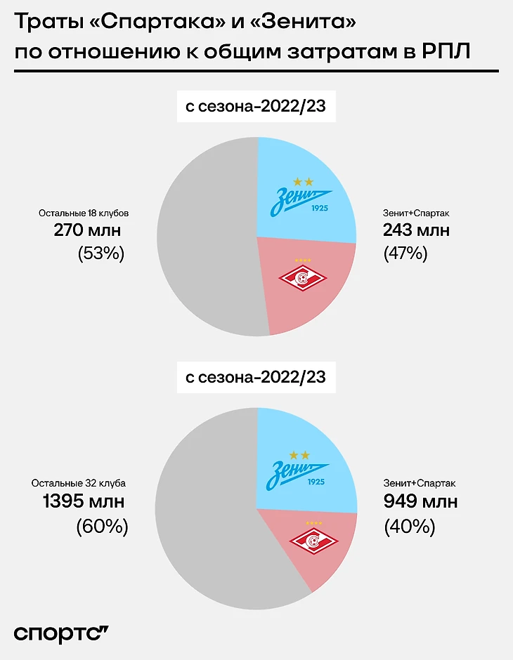С 2022-го, когда препятствий для трансферов стало гораздо больше, доля «Спартака» и «Зенита» только увеличилась.