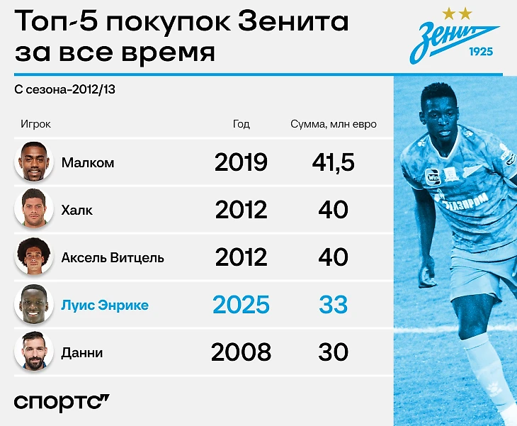 Вот пятерка самых крупных покупок «Зенита». Не считая активного летнего окна в 2012-м, разброс по годам заметный. При этом в пятерку попали трансферы от 30 млн евро.