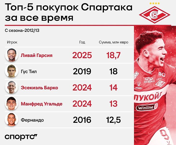 А вот топ-5 вложений «Спартака». До 2024-го почти целиком из трансферов второй половины 2010-х, но сейчас сразу три приобретения за последний год.