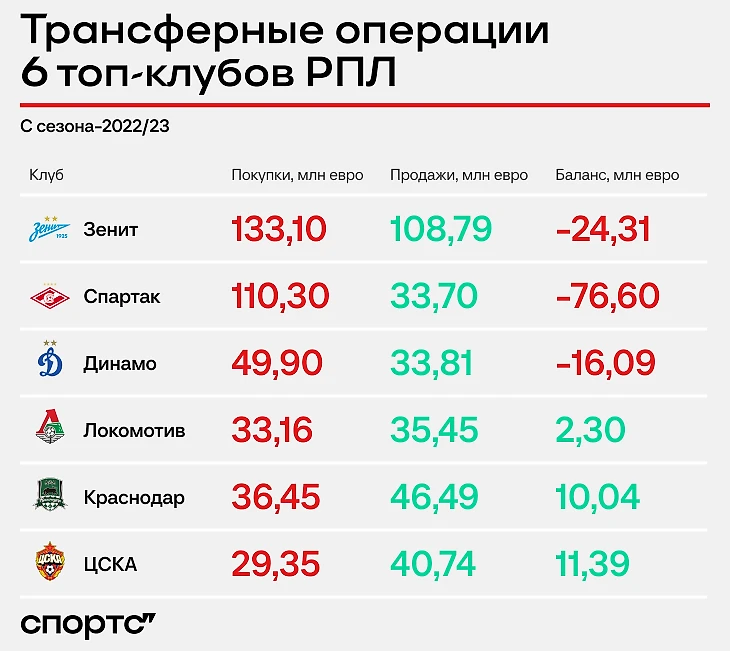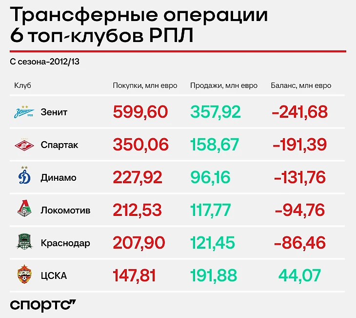 «Зенит» потратил почти столько же, сколько другие четыре топ-клуба, не считая «Спартака». Но и напродавал вдвое-втрое больше, чем любой из топов. Заметный перекос в отрицательную сторону пока только у «Спартака», причем до этого сезона минус был вдвое меньше (32 млн).