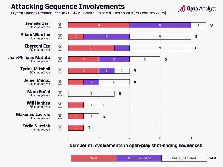 Показатель xG в 2,0 стал для «Пэлас» четвёртым в этом сезоне АПЛ за первые 45 минут. К концу основного времени они набрали 4,3 xG, самый высокий показатель клуба за всю историю АПЛ. Хотя это число было увеличено за счёт ударов с близкого расстояния Исмаилы Сарра и Эдди Нкетиаа, само создание такого количества моментов говорит в пользу хозяев.