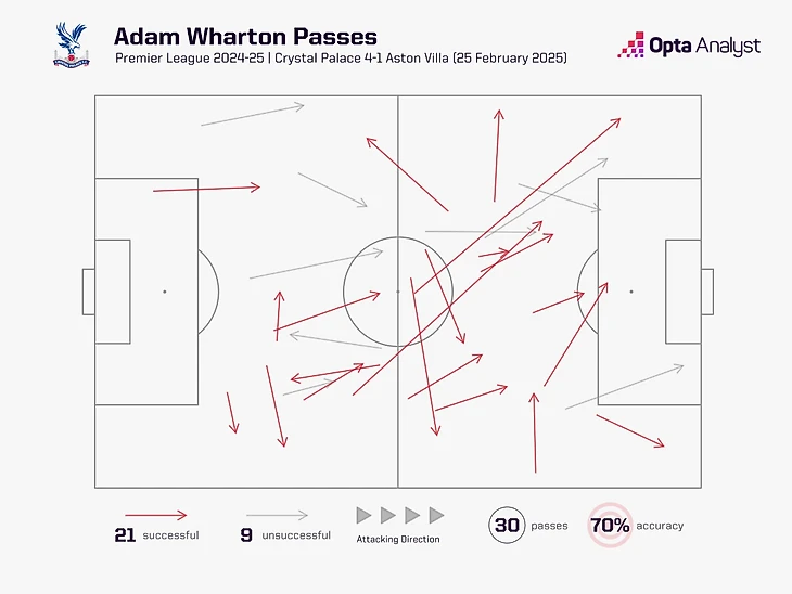 Да, чисто статистически у Уортона нет ассистов и голов, но именно он сыграл ключевую роль в каждом из первых трех голов «Пэлас». Его острые пасы, ловкое первое касание и способность контролировать мяч в ограниченном пространстве явно выделялись.