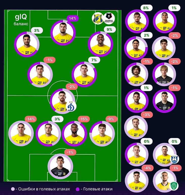 Оборонительные проблемы Ростова прекрасно отражает gIQ баланс, который имеет минусовое значение у более, чем половины игроков основы. Кроме Осипенко (о котором ниже) вся линия обороны имеет серьёзную долю результативных ошибок. Удивляет Ростов и тремя голкиперами, с минусовым gIQ – ситуация редчайшая! Уточним, что далеко не каждый пропущенный гол идёт в минус вратарю – речь именно об их ошибках, сформировавших голевую угрозу.