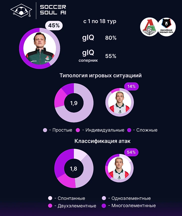 С точки зрения маркеров качества игры, Локомотив отличается от предыдущих команд. С результативностью сложных игровых ситуаций у железнодорожников ситуация ниже среднего (11% при норме в 16%), но 33% многоэлементных – это лучший показатель, среди всех предыдущих команд.