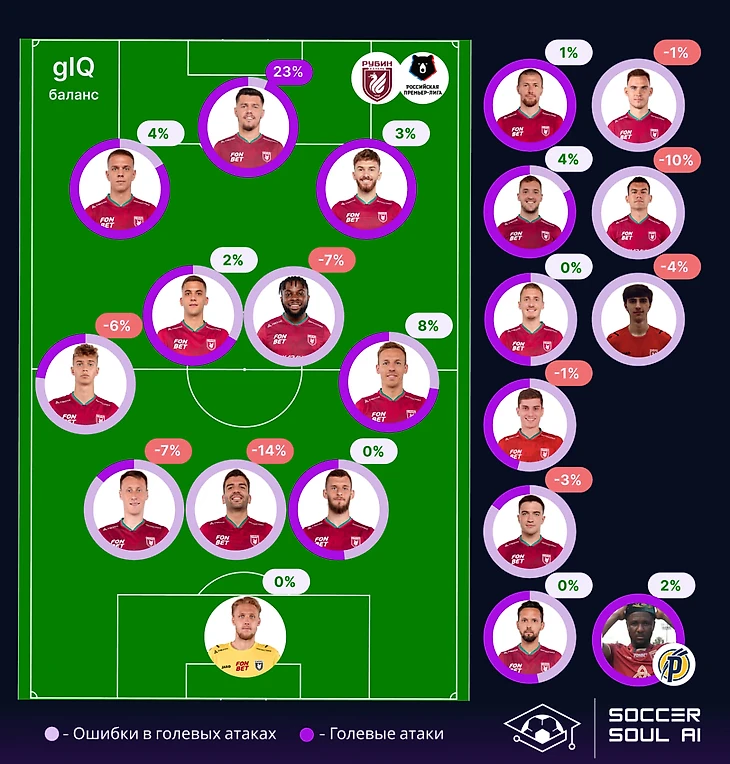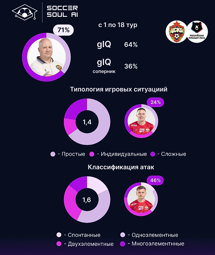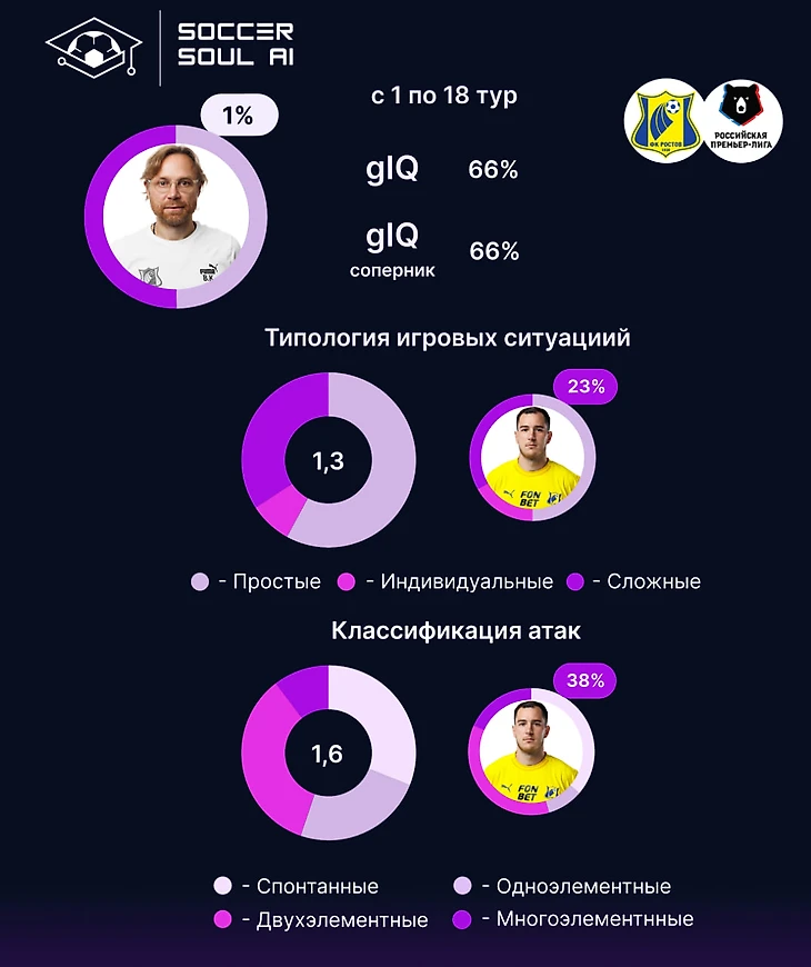 Собственный gIQ команды (75%) – ниже, чем у Зенита, Спартака, Динамо и Локомотива, но вот gIQ соперников – 27%! И Спартак, и Зенит позволяют соперникам больше. В большей степени за счет этой метрики, баланс Мусаева – самый высокий в РПЛ – 178%.