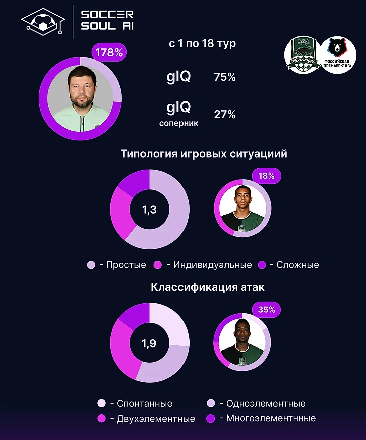 С точки зрения маркеров качества игры, Краснодар напоминает Зенит, но с менее выраженной долей двухэлементных атак и большей результативностью индивидуальных действий.