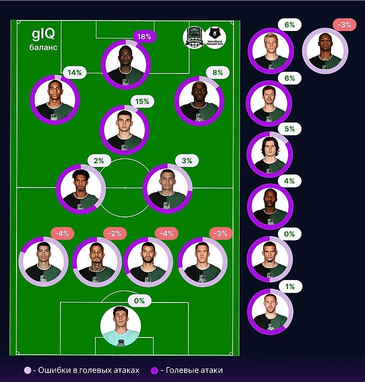 Несмотря на лучшую оборону в лиге, баланс результативных ошибок и участия в голевых атаках собственной команды у футболистов Краснодара распределяется так, что вся защитная линия имеет минусовые показатели. Но, суммарно их отрицательный вклад не самый большой. Для сравнения, в Рубине и Ростове есть сразу три футболиста, минусовая доля каждого из которых больше, чем у всей защиты Краснодара вместе.