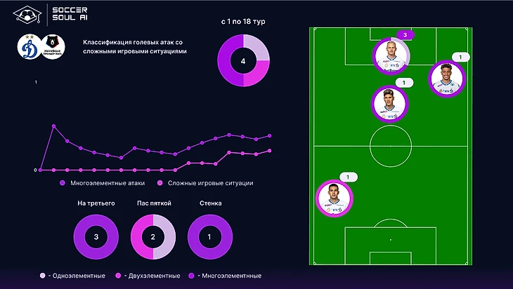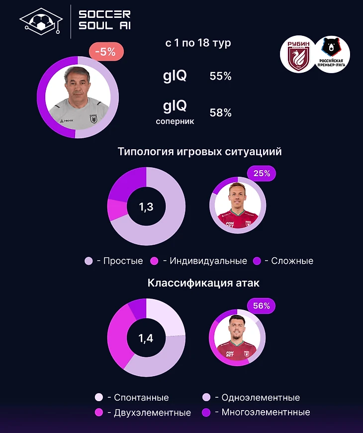 Из маркеров качества игры у команды работают сложные игровые ситуации, причем их уровень – 34% довольно высок, многоэлементность выражена скромно (10%), но и это выше, чем у Рубина – героя нашего первого экспресс-обзора.