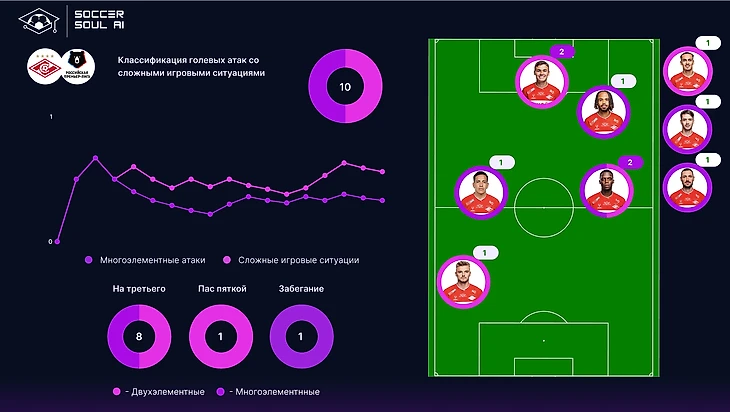 С точки зрения маркеров качества игры, Спартак, как большинство команд РПЛ, превышает норму по доле сложных ситуаций (18% vs16%) и недобирает по доле многоэлементности (17% vs 22%).