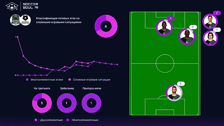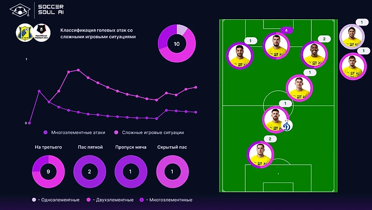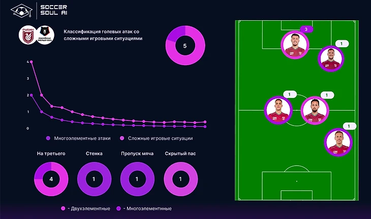 23% сложных игровых ситуаций – показатель очень хороший, но с точки зрения многоэлементности, и у армейцев всё довольно скромно. 14% это выше, чем у Рубина и Ростова, но ещё сильно ниже нормы (22%).