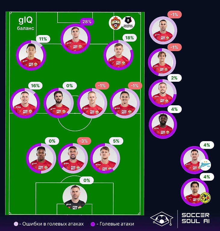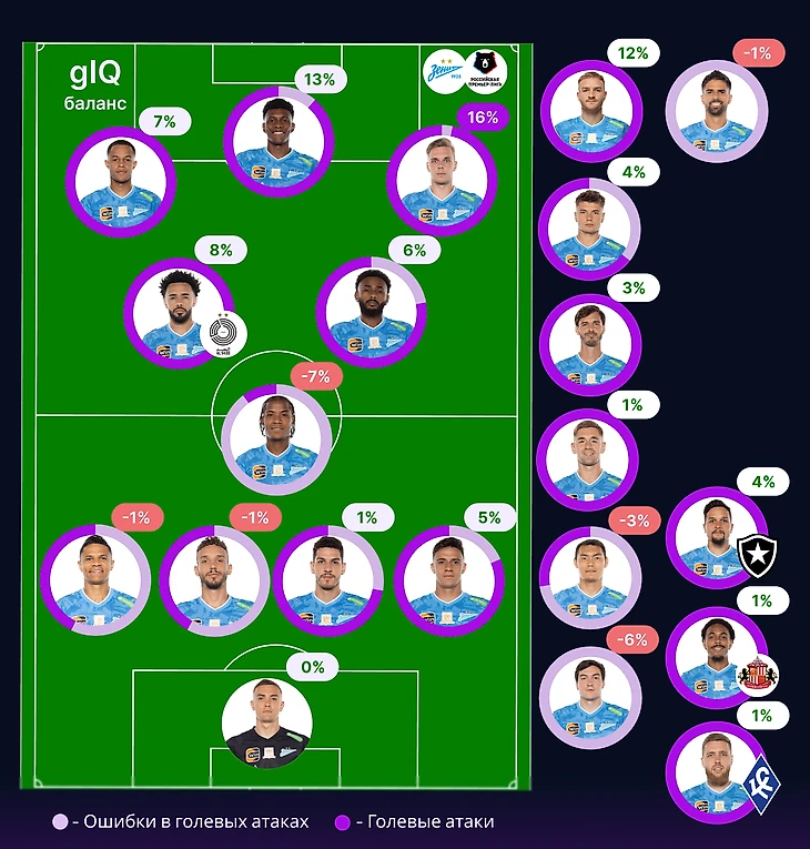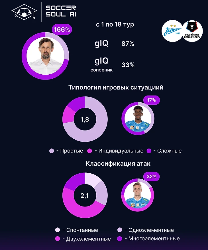 Зенит – команда с максимальным gIQ (87%) в РПЛ и gIQ соперников (33%) равным показателю Спартака. Таким образом по первой метрике команда Семака – лучшая, по второй – делит вторую и третью позицию с принципиальным соперником. 166% баланса самого главного тренера соответствует месту, занимаемому командой на данный момент.