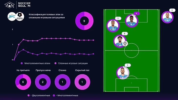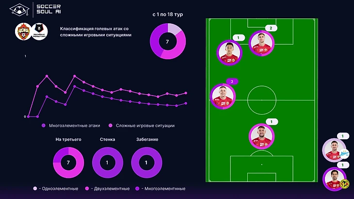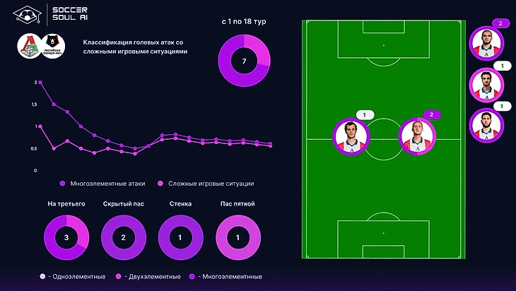 У команд РПЛ в массе присутствуют проблемы с многоэлементными атаками. В этом контексте позитивно выделяется лишь Локомотив. Среди остальных есть команды, которым качество состава позволяет добиваться результата с более простыми атакующими действиями (Зенит, Спартак), есть те, кто делает ставку на высокую долю сложных игровых ситуаций (Ростов). В целом, со сложными ситуациями у команд ТОП-8 всё выглядит неплохо – можно констатировать, что этот маркер качества в РПЛ работает.