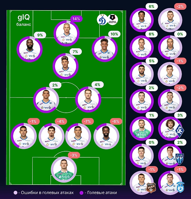 Баланс игроков обороны Динамо очень напоминает картину Локомотива: четыре защитника и вратарь суммарно собирают -21% (-22% у Локо). Но, команда Лички выгодно отличается балансом игроков опорной зоны (Чавес, Фомин) и как будто отсутствием ярко выраженного фаворита в атакующей четвёрке.