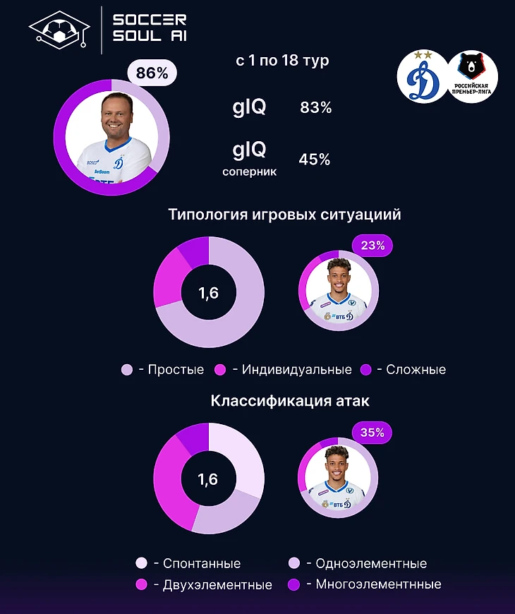 gIQ динамовцев достаточно высок (83%), а учитывая, что с точки зрения оборонительной составляющей (gIQ соперников 45%), уступают они (из ранее оцененных конкурентов) только ЦСКА, завершала осеннюю стадию команда неплохо.