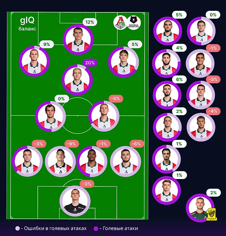 Оборонительные проблемы Локомотива демонстрирует и gIQ баланс игроков линии защиты, включая голкипера. Здесь нет ни одного игрока, минусовой баланс которого был бы двузначным (как у того же Рубина или Ростова), но Локомотив – первая команда в нашем обзоре, где абсолютно у всех защитников результативные ошибки преобладают.