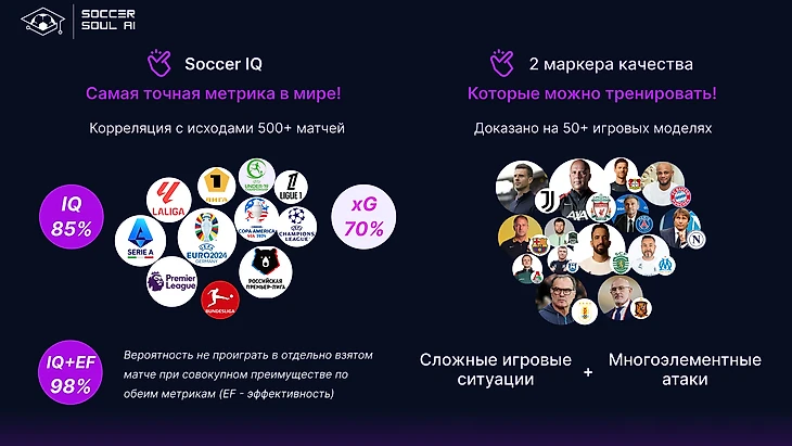 Для удобства восприятия, метрики отображаются в формате общепринятого IQ, применяемого в психологии и нейробиологии, а в качестве модельного ориентира (100% показатель), выступает среднее значение лидеров ТОП-5 европейских чемпионатов.