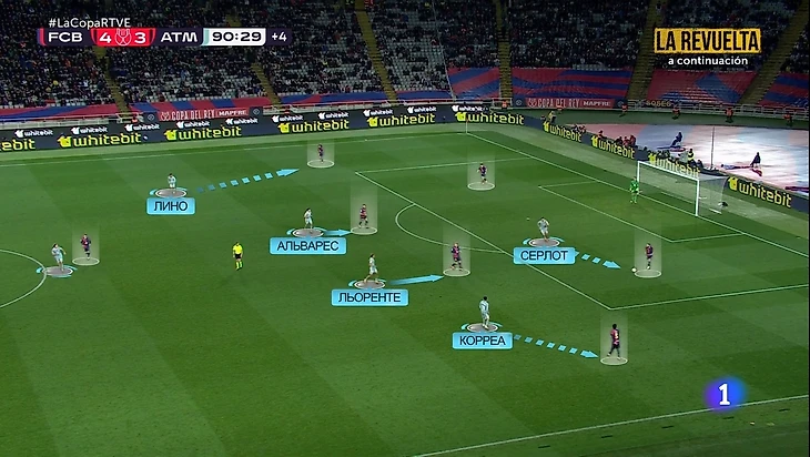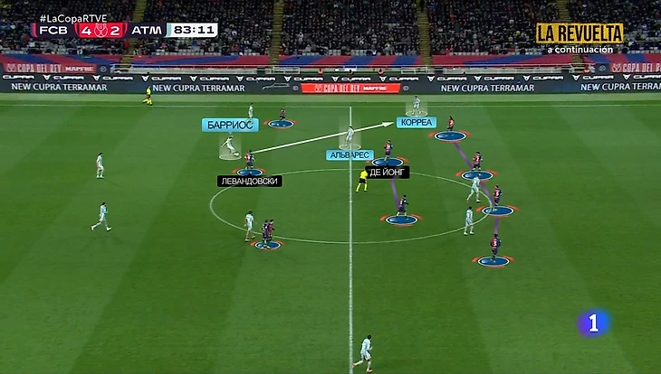 Каталонцы стали больше времени проводить в обороне возле своей штрафной, что очень далеко от привычного режима команды Флика. В третьем пропущенном голе сказался чересчур атакующий подбор игроков у «Барсы», а также усталость. Начало эпизода – на Барриоса вообще не оказывается давление, и он легко делает передачу на Корреа: