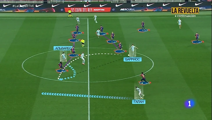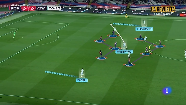 Мы ранее уже отмечали, что команда Флика в среднем и низком блоке действует очень компактно, что в сочетании с всегда приподнятой линией обороны делает ее уязвимой к переводам на фланги. Именно этим и занялся «Атлетико» в первой атаке: сначала стянули «Барсу» на один фланг и резко перевели на другой – передача шла на Галана, но за нее зацепился Альварес, что, кажется, лишь сильнее смутило защиту «Барселоны»:
