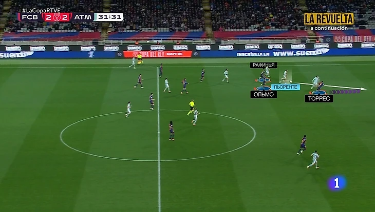 Вероятно, такое изменение связано с наполнением атаки – Торрес, в отличие от Левандовского, способен давать большой беговой объем и обладает отличной скоростью. Один из своих моментов он как раз получил благодаря расположению в прессинге: Ольмо и Рафинья просто несутся на Льоренте, и тот катит Феррану под выход 1-на-1: