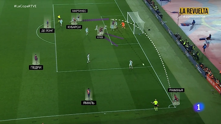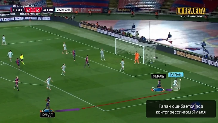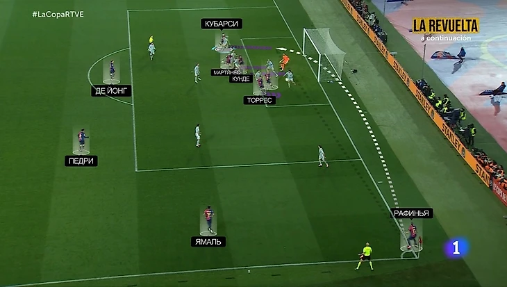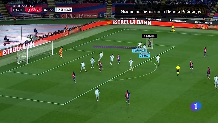 Четвертый гол «Барса» забила снова через фланг Ламина Ямаля – в этот раз он просто не заметил Рейнилду, который как раз вышел для сдерживания Ламина, так как Галан уже давно перестал справляться: