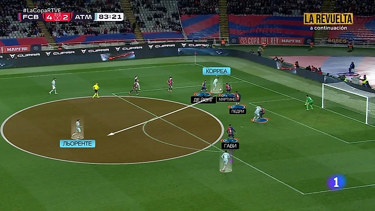 «Атлетико» разыграл мяч на фланге и дошел до штрафной. Френки де Йонг до конца следует за Корреа, хотя в этом нет никакой необходимости – его уже встречает Мартинес с подстраховкой (Педри). Зато опорная зона открыта нараспашку – оттуда Льоренте и забивает дальним ударом: