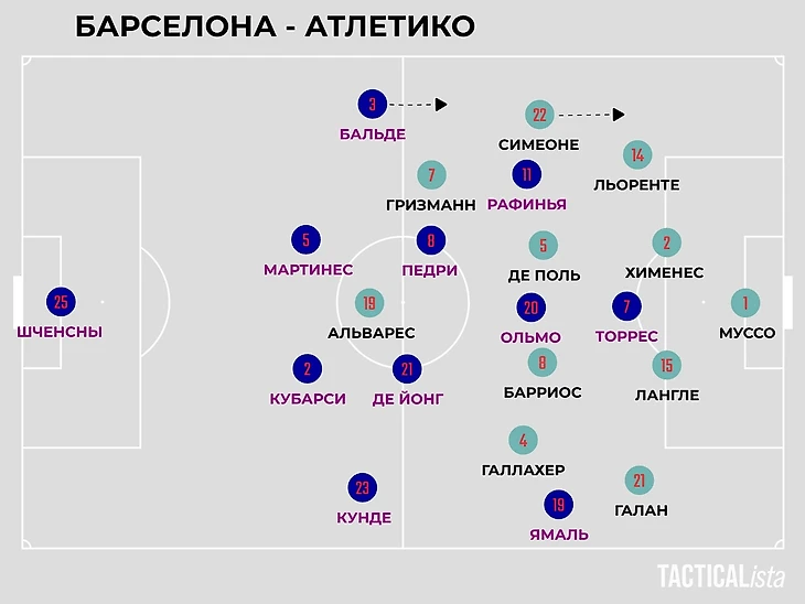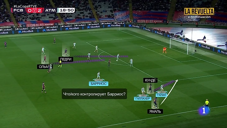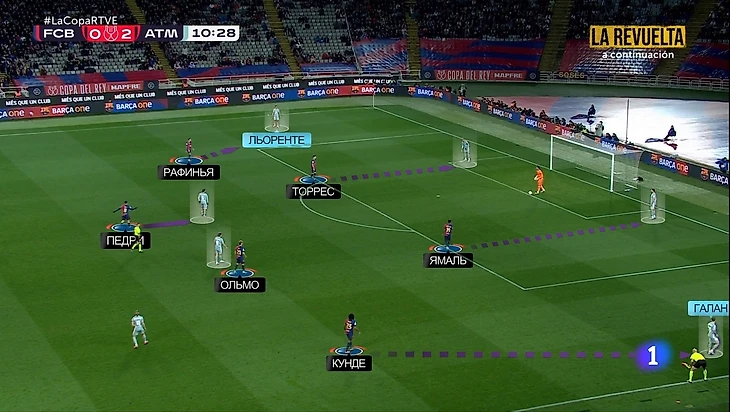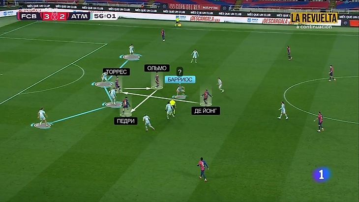 Но даже попав под такой холодный душ на первых же минутах, «Барса» продолжила играть настолько же смело и открыто, и это стало приносить плоды. Во-первых, стоит отметить изменения в прессинге каталонцев относительно предыдущих матчей. Структура осталось такой же, но внутри нее немного изменились роли игроков. Если раньше нападающий опускался к десятке и играл по опорнику соперника (при этом на ЦЗ давили вингеры), то в этот раз Торрес был на линии с Ямалем, Педри поднимался к Ольмо, чтобы прессинговать опорников, а Рафинья давил на крайнего защитника «Атлетико» (Льоренте):