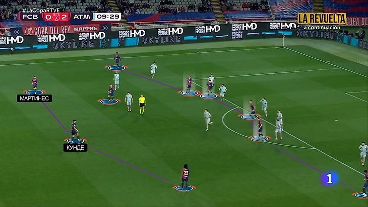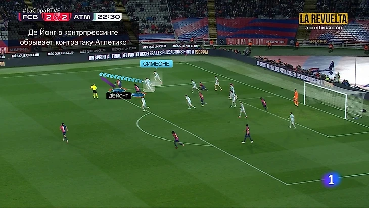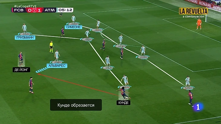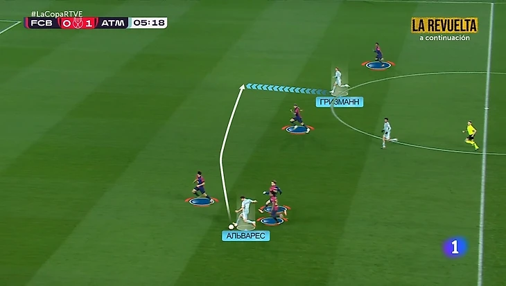 Быстрый гол «Атлетико» заставил каталонцев реагировать. И без того открытая команда Флика стала располагаться еще смелее. Во многом из-за этого «матрасники» быстро забили второй – уже в контратаке. Начался эпизод с небрежного паса Кунде на Френки де Йонга: здесь «Атлети» держит свои привычные 5-4-1 в низком блоке – Симеоне садится пятым защитником в линию, Гризманн в полузащиту, а Альварес остается единственным нападающим, как раз контролируя Френки. Именно поэтому ему не составляет труда перехватить пас Кунде, разогнать атаку и блестящим пасом найти Гризманна: