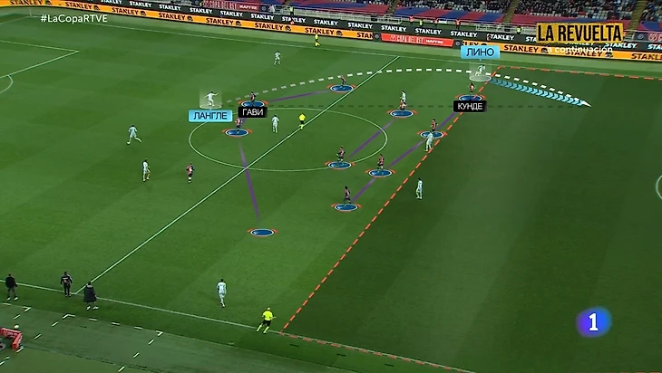 «Барселона» атаковала ярко и разнообразно, нагружая как чужую опорную, так и фланги. Например, в первом голе сработала связка Ямаль – Кунде. Ламин великолепным пасом на ход подключает Жюля к атаке, при этом у француза есть вариант под катбэк во многом благодаря тому, что Барриос располагается в полупозиции и просто смотрит футбол: