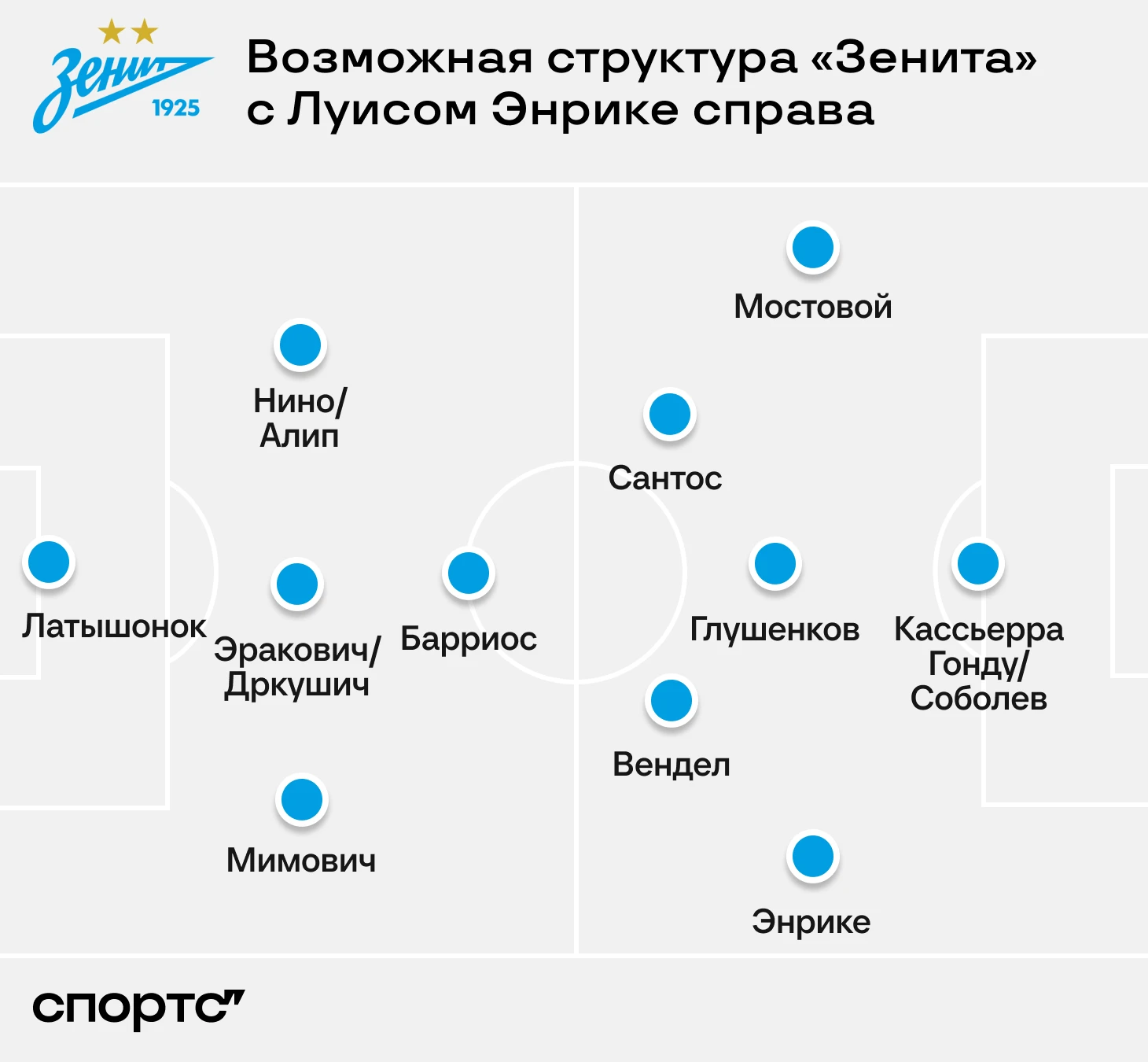 Это привело к новой схеме. Теперь «Зенит» использует 4-2-3-1, где Вендел и Вильмар Барриос – пара опорников, а Максим Глушенков – правый вингер или десятка. Пока атакующая четверка «Зенита» непредсказуема: в разных матчах слева выходили Андрей Мостовой и Луис Энрике, справа – Глушенков и Энрике, под нападающим – Глушенков и Матео Кассьерра.