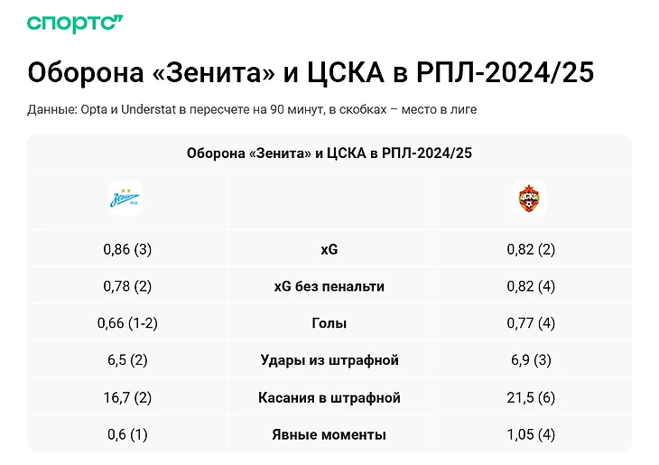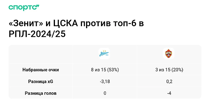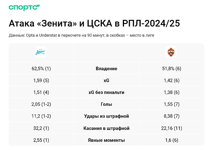 По ожидаемым голам ЦСКА почти не уступает «Зениту». Но если копнуть глубже, разница очевидна: ЦСКА набил статистику против аутсайдеров, проваливался против конкурентов, терял скорость с закрытыми соперниками, из-за чего реже оказывался в чужой штрафной.