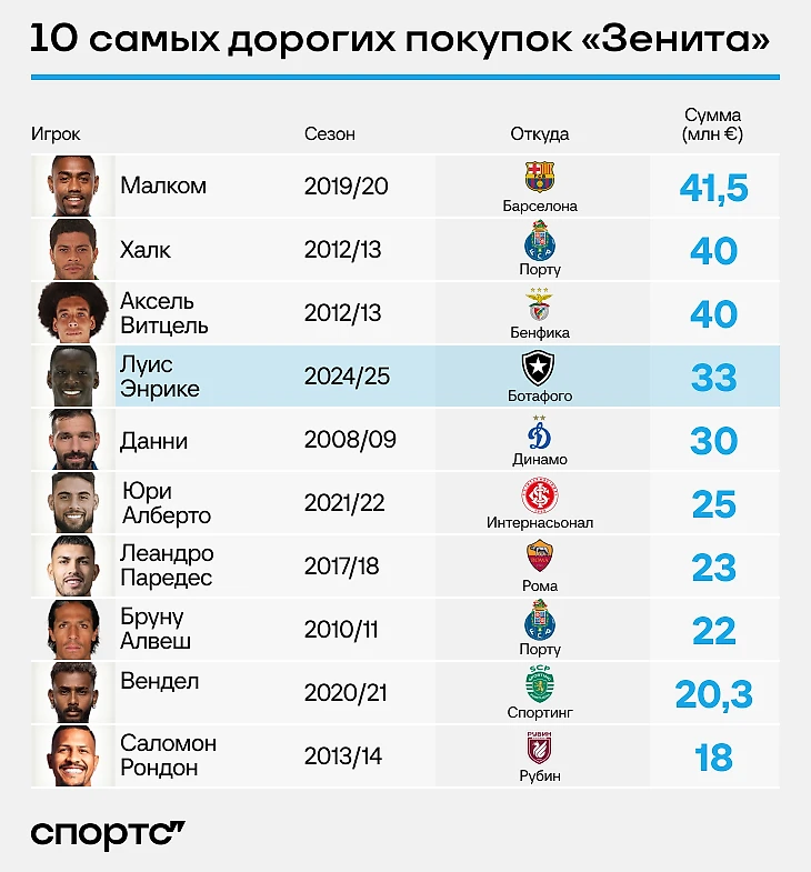Энрике ворвался в топ трансферов «Зенита», дороже за всю историю клуба, по данным трансфермаркта, были только трое.