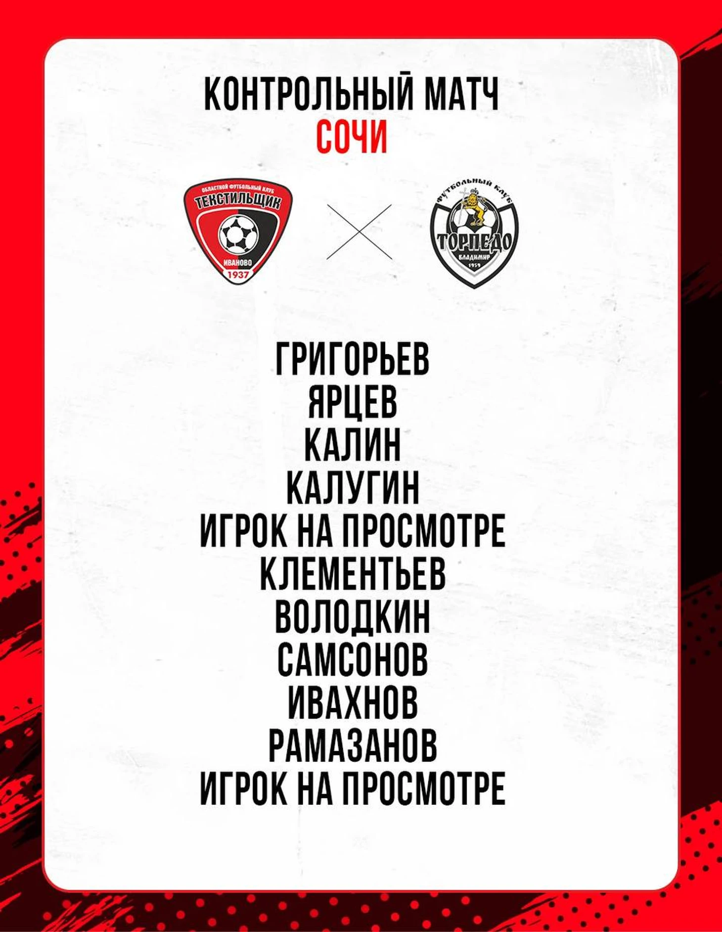 Счет открыл Илья Клементьев забив с углового на 14 минуте. На 20 минуте «Торпедо» сравнивает счет.Однако, на 36 минуте Максим Поляков вывел ивановцев вперед. Во втором тайме на поле появились несколько игроков,которые были на просмотре.