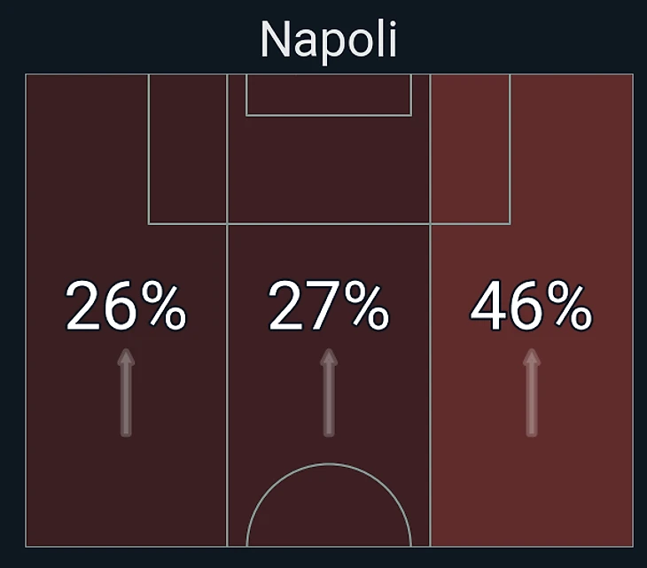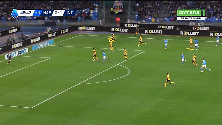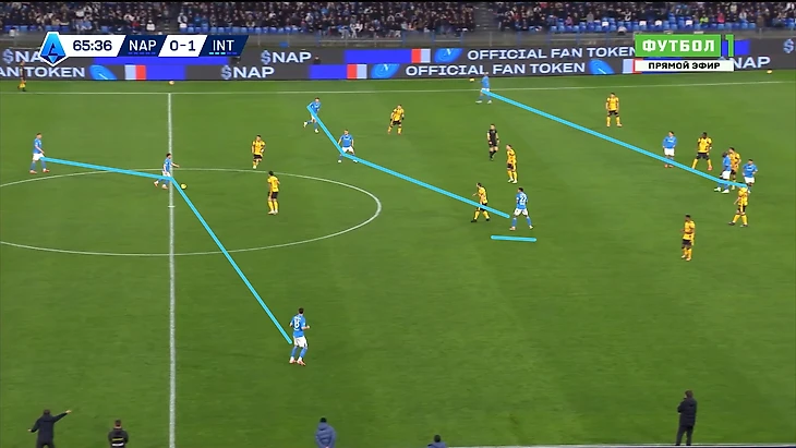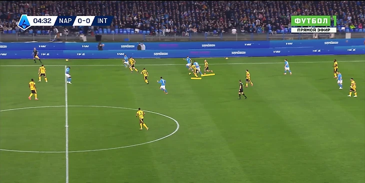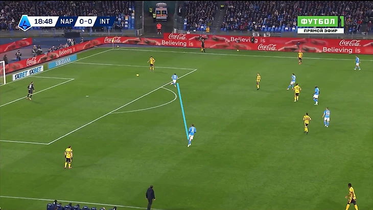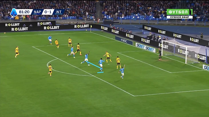 «Наполи» же на это дело ответил монструознейшим образом, полностью взяв мяч под контроль и постепенно раскатывал оборону соперника в своих 3-3-4, где уже даже Ди Лоренцо обнаглел настолько, что мог спокойно инвертироваться вблизи финальной трети: