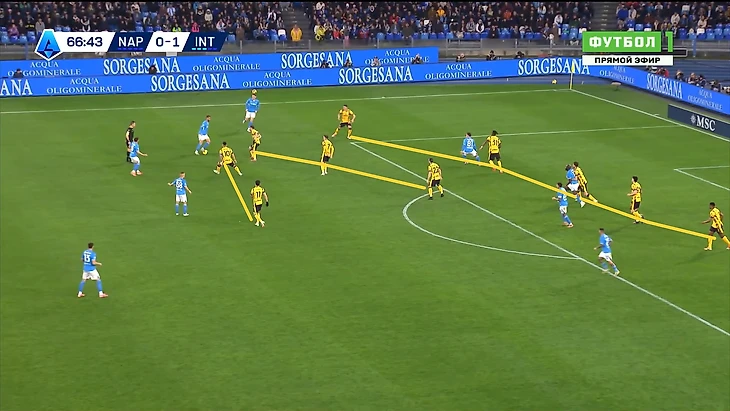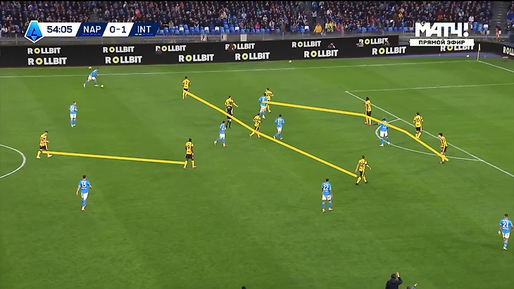 Однако особого толку от всех стараний в прохождении прессинга соперника «Интера» в целом, и Мартинеса в частности, т.к что на мяче в этот момент у «нерадзурри» получалось откровенно мало (показатель владения близился к отметке 70 на 30 в пользу «южан», а наклон поля ее как раз достиг), что в прессинге, высокая составляющая которого в тот момент выглядела как-то так: