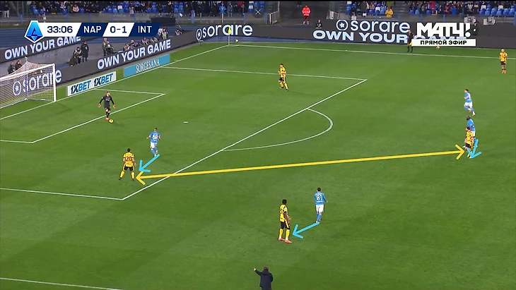 Однако к концу тайма, когда хозяева еще сильнее придавили, уже и до полноценного сдвоения фланга доходило, ведь Димарко раз за разом, даже в долгих позиционных атаках соперника, просто не возвращался назад: