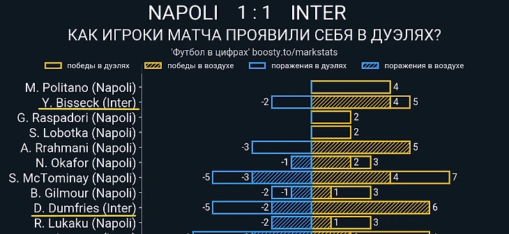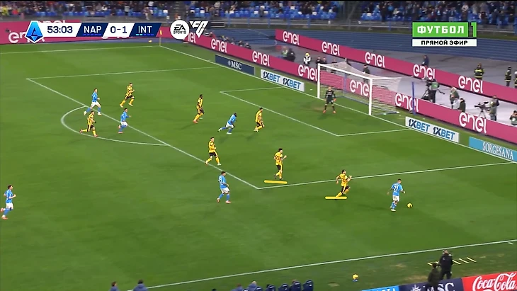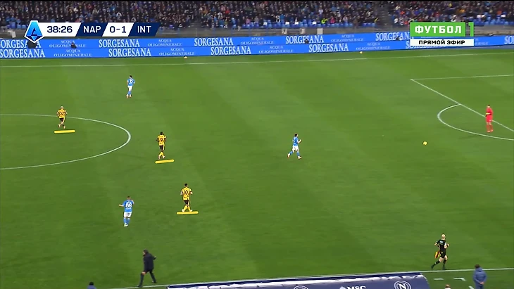 Хотя в целом, опасных ситуаций у ворот гостей возникало не так даже в самые трудные для них отрезки, ведь «нерадзурри» не особо-то и пытались выходить исключительно через короткий пас, и зачастую могли сыграть надежнее, просто выбив мяч, что, с одной стороны, существенно снижало шансы удвоить преимущество, а с другой – не давало даже повода для серьезных ошибок вблизи своих ворот. Поэтому и цифры по эффективности прессинга «неаполитанцев» не то, что бы восхищают: