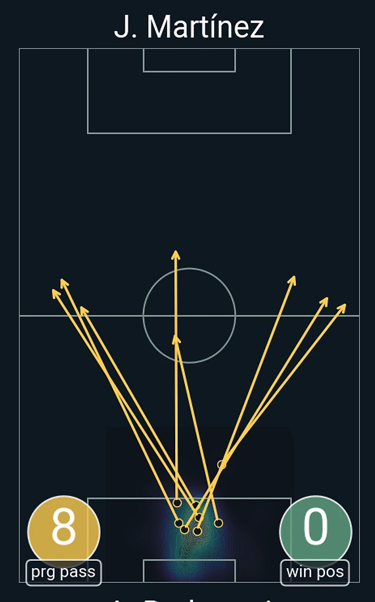 Здесь же еще затронем самый сложный отрезок тайма для «Интера» – сразу после своего гола соперник просто задавил «нерадзурри» вышеописанным персональным прессингом, и в такой сложный момент особенно контрастно выглядел Хосеп Мартинес, который, к слову, более чем достойно заменил Зоммера, особенно по части первого паса в билд-апе, и в этот самый тяжелый момент он очень сильно помогал своей команде хоть как-то преодолевать это давление своими продуманными лонгболлами: