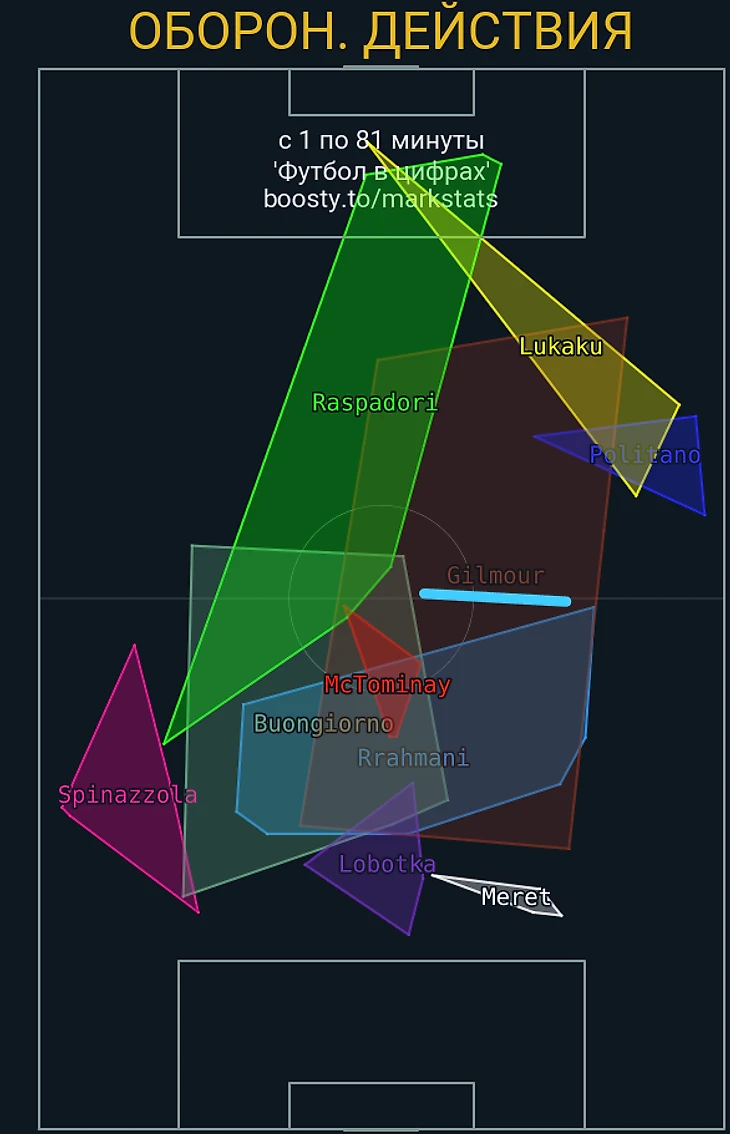 Вообще, прессинг-система «Наполи» в этом матче, как и в принципе после травмы Нереса и перехода на 3-5-2 без мяча, – вещь, временами, очень удивительная. Так, например, в первой линии прессинга спокойно могла оказаться пара Гилмор-Мактоминей: