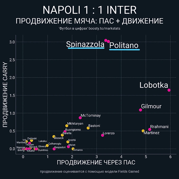 В первую очередь, конечно, через фланги, причем как даже Спинаццола, через которого шло лишь 26% атак, показал себя феноменально в продвижении мяча с помощью дриблинга. Ну и Политано, на какие бы тактические ухищрения не шел Индзаги, дабы нейтрализовать Матео, тоже отменно продвигал мяч таже путем дриблинга:
