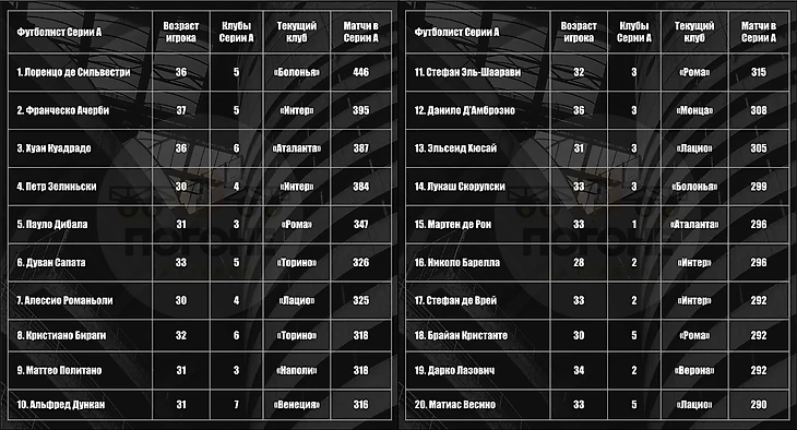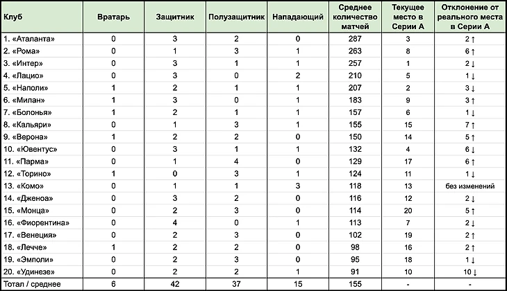 Капитан «Аталанты» Мартен де Рон выделяется в этом топ-20 единицей в столбце «Клубы Серии А». В среднем остальные 19 футболисты играли за 4 (3,8 – если быть точным) разных клуба итальянского чемпионата. Лидер – полузащитник «Венеции» Альфред Дункан поиграл за еще 6 разных команд: «Интер», «Ливорно», «Сампдорию», «Сассуоло», «Фиорентину» и «Кальяри».