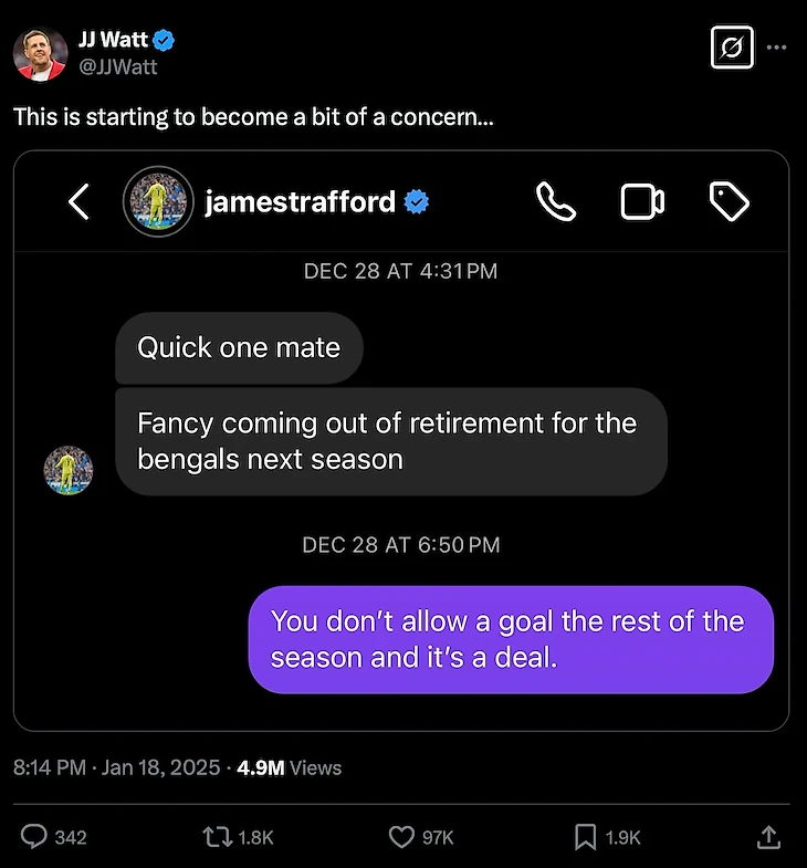 Траффорда брали под АПЛ, но там он провалился – как и вся команда Компани. А вот в Чемпионшипе Джеймс заблистал, причем его сухая серия началась с шутливого спора с одним из совладельцев «Бернли», экс-игроком НФЛ Джей Джей Уоттом. В конце декабря вратарь попросил американца возобновить карьеру, а в ответ получил условие: «Если не пропустишь до конца сезона».