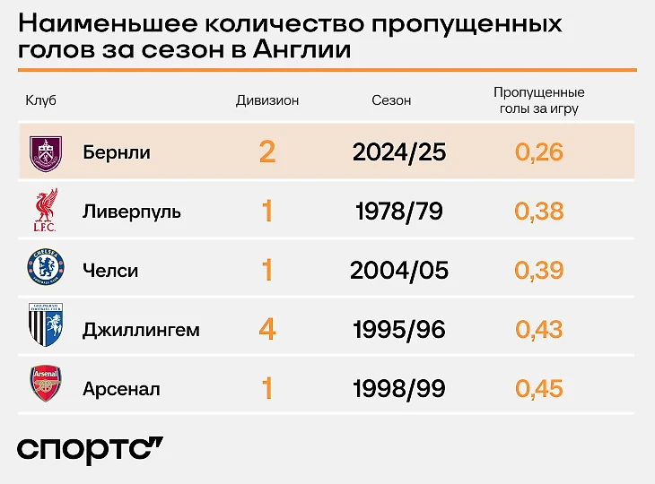 При нынешнем аномальном темпе «Бернли» к концу сезона пропустит всего 12 мячей, тогда как рекорд для 46 туров удерживает «Джиллингем»: 20 пропущенных в середине 1990-х, но это в четвертом дивизионе.