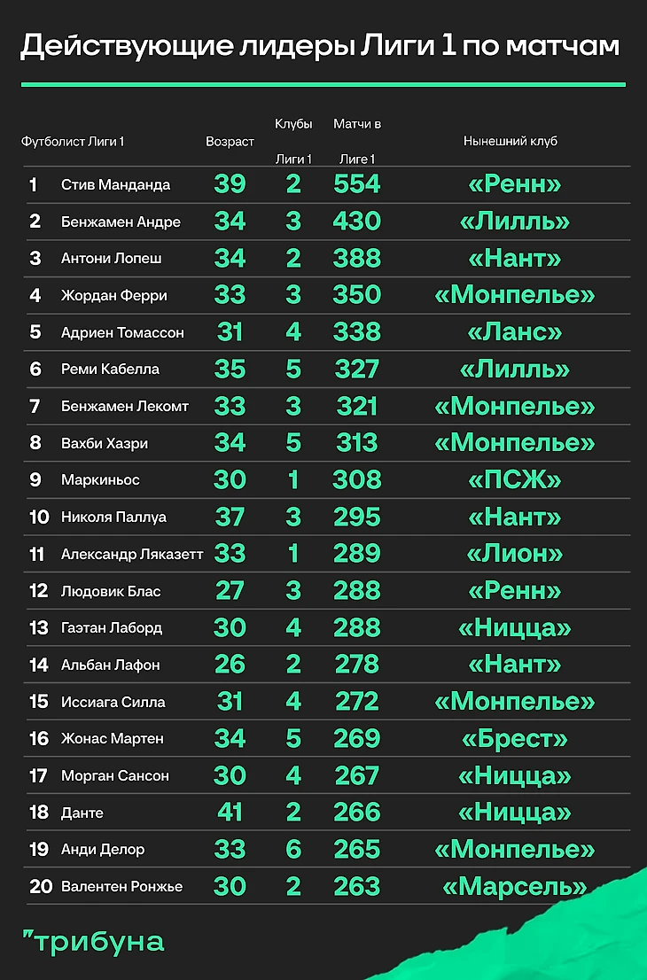 Ниже представлена таблица, в которую внесены двадцать футболистов, имеющих наибольшее количество матчей во французском высшем дивизионе (но только среди тех, кто играет там на данный момент).