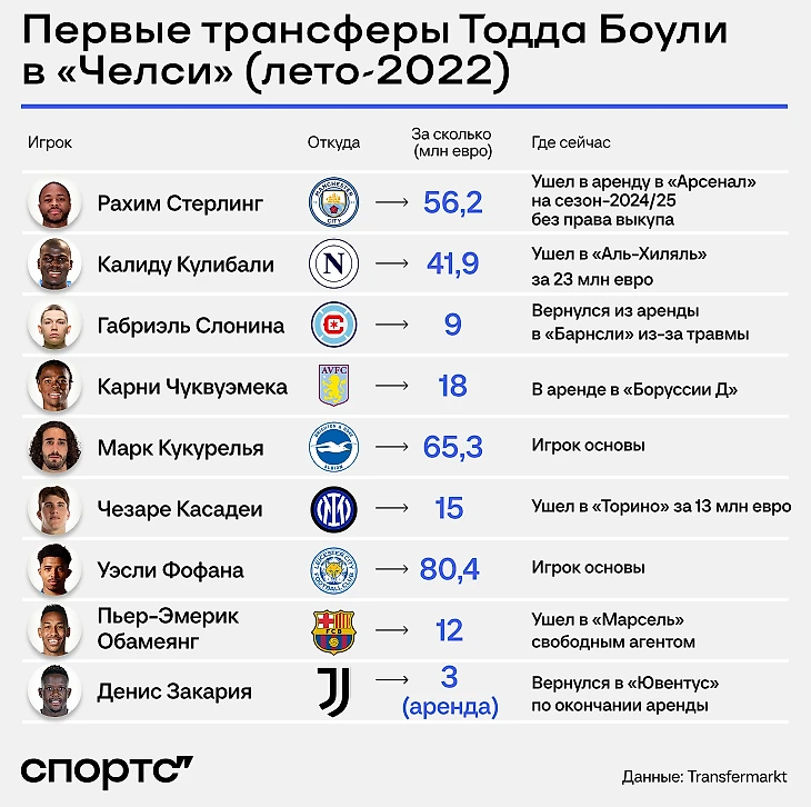 Безумный шоппинг начался летом 2022-го: Боули убрал предыдущее руководство и лично взялся за покупки. Итоги удручающие: потратили почти 300 млн евро, из девяти новичков в «Челси» остались двое.