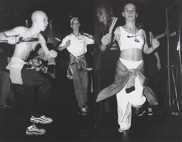 Еще одна отличительная особенность габбер-вечеринок 1990-х – явный гендерный перекос. Из-за агрессивной музыки и футбольной субкультуры девушек было мало – в районе 20%. А атмосфера была наполнена клубящимся тестостероном, что находило отражение в названиях групп и треков. Например, No Women Allowed («Женщинам здесь не место») от хардкор-группы Sperminator. Редких девушек называли габберинами или gabber-bitches. Они тоже выглядели максимально брутально: те же кроссовки и спортивные костюмы, прическа андеркат с выбритым затылком и висками.