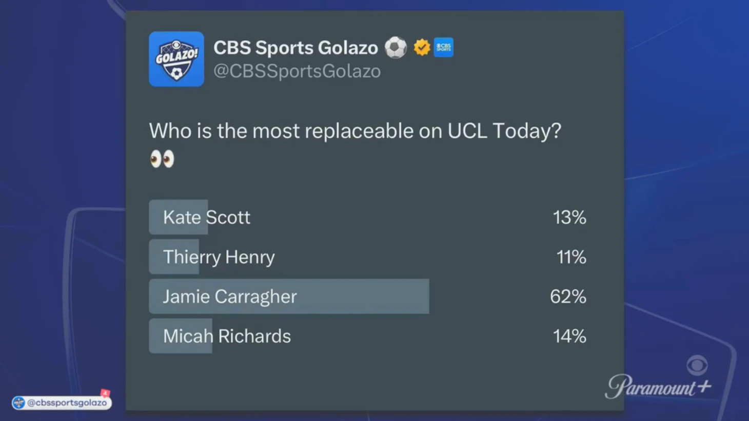 🎥 Каррагер инициировал опрос на самого заменимого эксперта CBS Sports. До этого он испортил воздух в студии 🙈