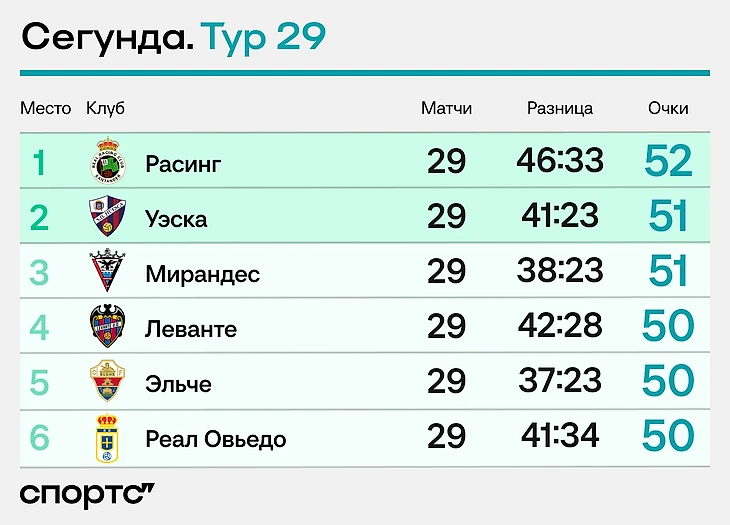 Аналогичная дистанция была внутри топ-5 за два тура до конца Сегунды-2022/23: такое расстояние было между лидировавшей «Гранадой» и «Леванте» с пятого места.