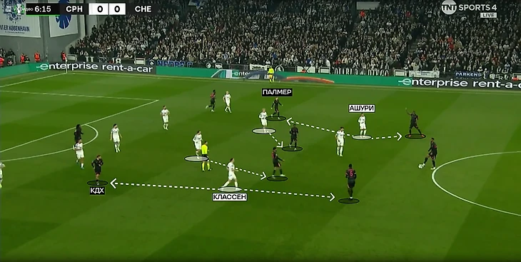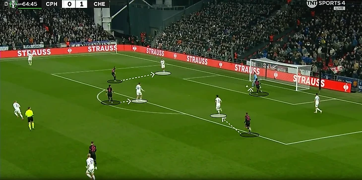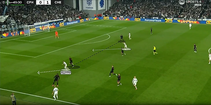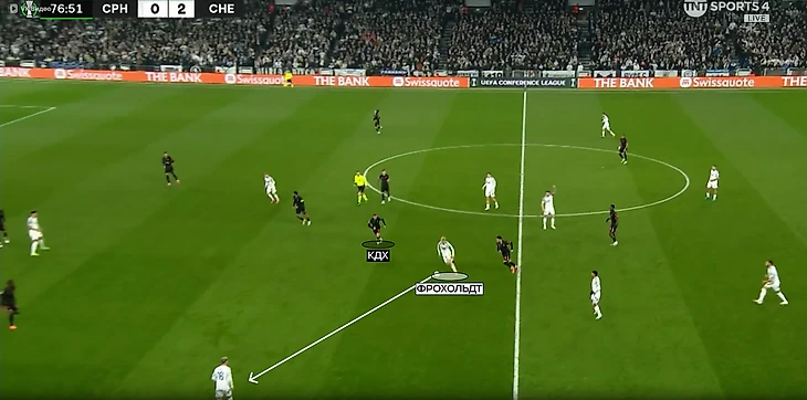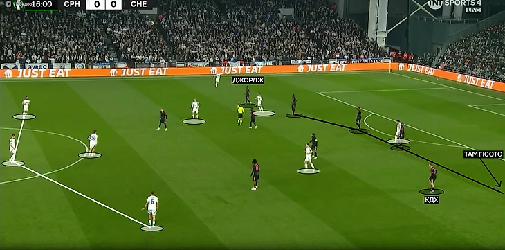 Пять атакующих футболистов «Копенгаген» застали врасплох защитную четвёрку «Челси». Выход был один – более глубокая позиция КДХ и Джорджа, что, конечно, могло спасти команду от лишних забросов за спину, но сильно била по атакующему потенциалу команды – игроки бы больше нужного тратили силы на оборону, и на атаку их могло просто не хватить.