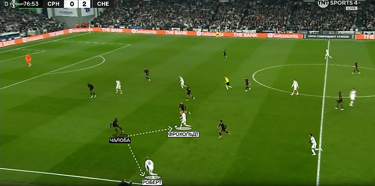 Далее, в неудобном положении становится Чалоба. Трево разрывается между Робертом и Фрохольдтом, ранее не реагируя на выпад опорника датчан. Через некоторое мгновение Чалоба нарушит правила, и «Копенгаген» получит тот самый результативный штрафной.