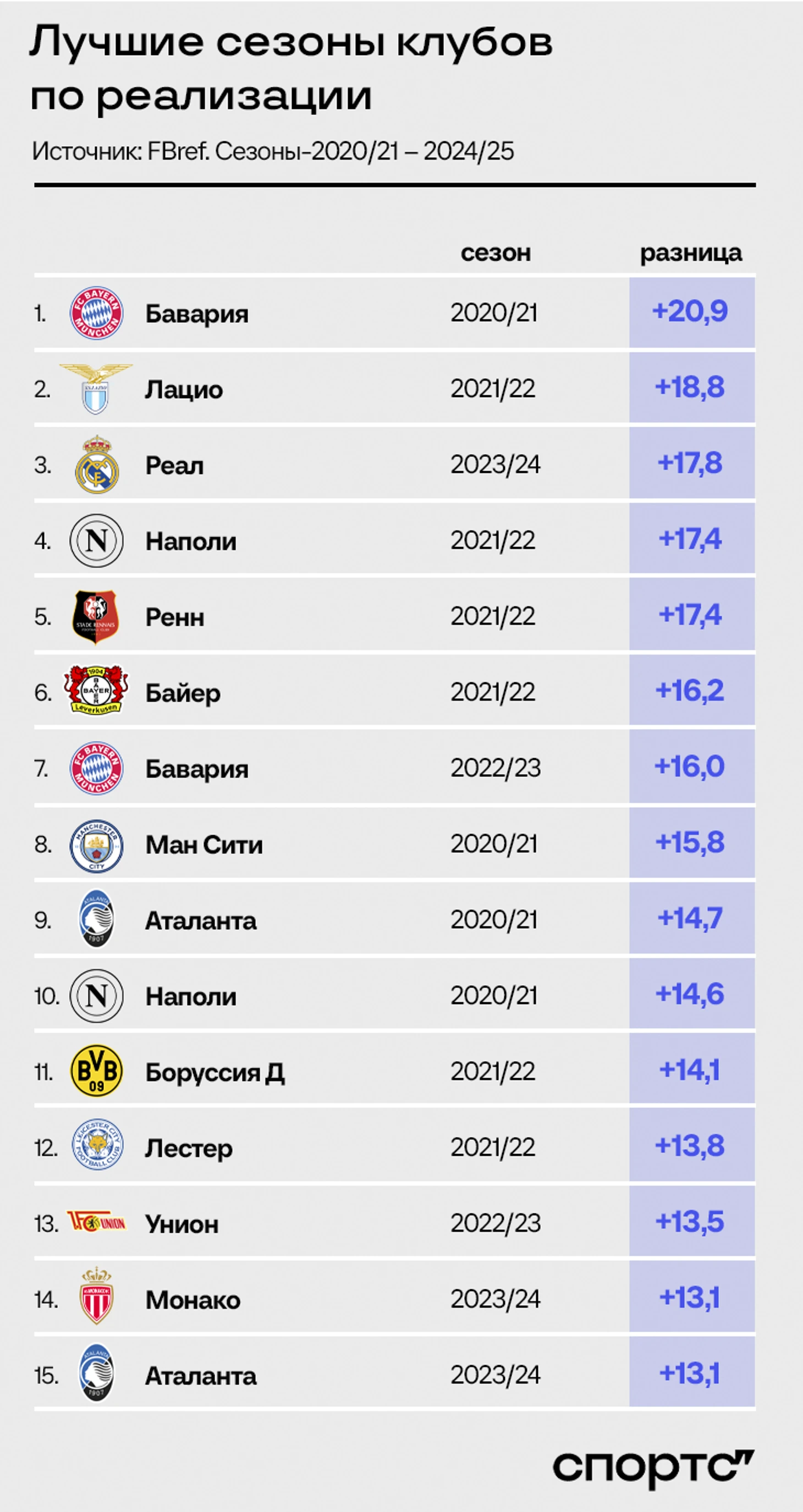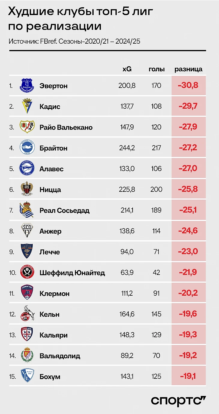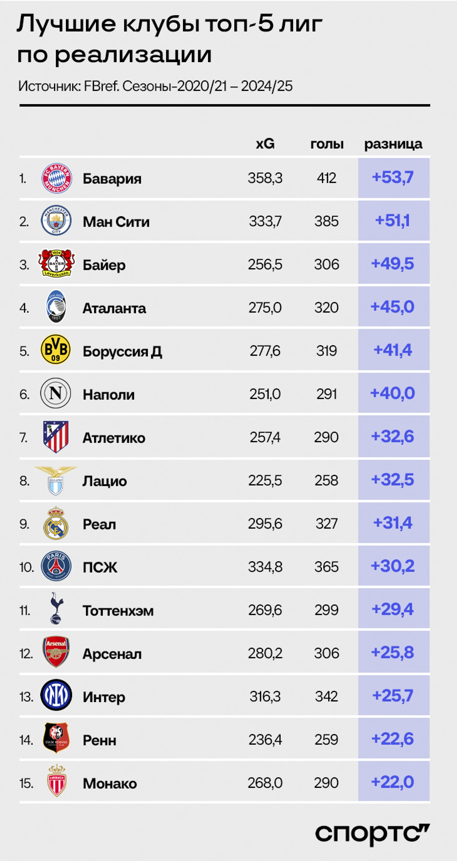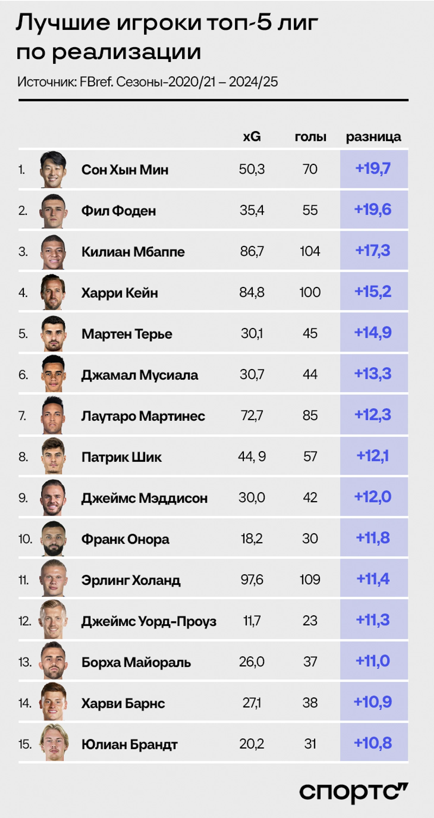 В этом мини-исследовании мы выделили футболистов и клубы топ-5 лиг Европы, которые элитно или ужасно реализуют моменты (фактических голов больше или меньше, чем ожидаемых). В основе подсчетов – база данных сайта Fbref. Для глубины выборки мы учитывали реализацию за последние пять сезонов – с учетом близкого к завершению сезона-2024/25.